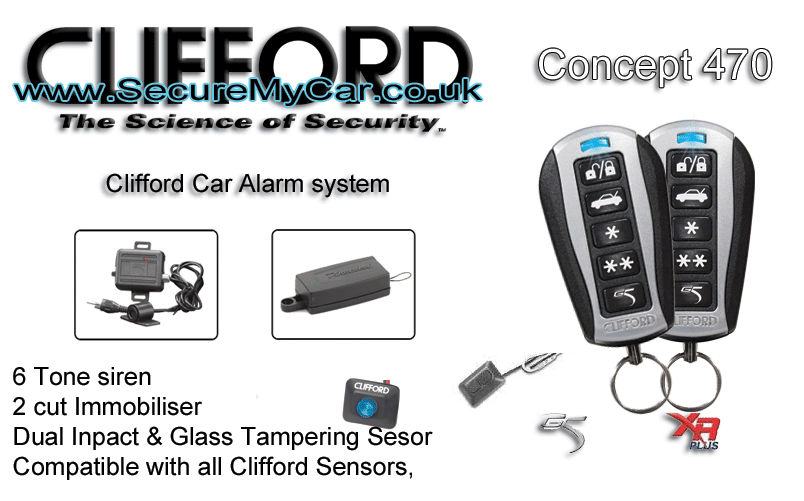 Clifford car alarms are the leaders in vehicle security with over 20 years in the industry. Clifford have a car alarms to suit everyones needs whether its cliffords cat 1 thatcham approved car alarms to there entry level arrow 5.1 car alarms. The arrow 5.1 car alarms comes with protection to the boot bonnet and doors aswell as dual shock sensor and immobiliser. The clifford arrow 5.1 car alarm can also be fitted to almost every vehicle on the market today. Cliffords next car alarm on offer is the clifford concept 470 which boasts the same features as the clifford arrow 5.1 car alarm but also comes with a glass tampering sensor, tilt and motion sensor and an extra immobiliser. The clifford concept 470 car alarm also comes with two five button remotes when the arrow 5.1 car alarms only come with 3 button remotes. the clifford concept 470 also comes with clifford super bright blue led. Cliffords cat 1 entry level car alarm system is the clifford concept 650 mk2 car alarm system. with dual immobilisation and cliffords legendary daul proximity sensor with warn away. the clifford concept 650 cat 1 car alarm system also comes with cliffords battery backup siren and cliffords anti hijack blackjax system. The clifford concept 650 mk2 car alarm also won best car alarm system and best cat 1 car alarm system in the 2009 me awards. No other cat 1 thatcham approved car alarm comes close the clifford concept 650 mk 2 car alarm. Clifford car alarms flagship thatcham cat 1 insurance approved alarm system is the avantguard 5.5 car alarms system. The clifford avantguard 5.5 comes with clifford dual proximity sensor, tilt an motion sensor aswell as clifford glass tampering sensor. The clifford avantguard 5.5 cat1 also comes with cliffords blackjax antihijack clifford car alarms battery backup siren and is completely programmable through cliffords cliff wizard software. The clifford avantguard 5.5 cat car alarm also comes with remote engine start. at the the touch of a button your car alarm will start your car on those cold winter mornings and warm your car. clifford intellistart module will fit on to any clifford car alarm system including the clifford arrow 5.1 car alarm and the clifford concept 470 car alarm aswell as the clifford concept 650 cat 1 car alarm system. All clifford extra sensor and parts including remote engine start is designed to fit on to any clifford g5 and g4 car alarms. We are based in the bristol city centre and have been fitting clifford car alarms now for over 15 years. We cover mobile fitting in Bristol bath london exeter Birmingham Coventry Leicester Cardiff Newport Gloucester Yate Bristol south west wales essex sussex middlesex luton kent.