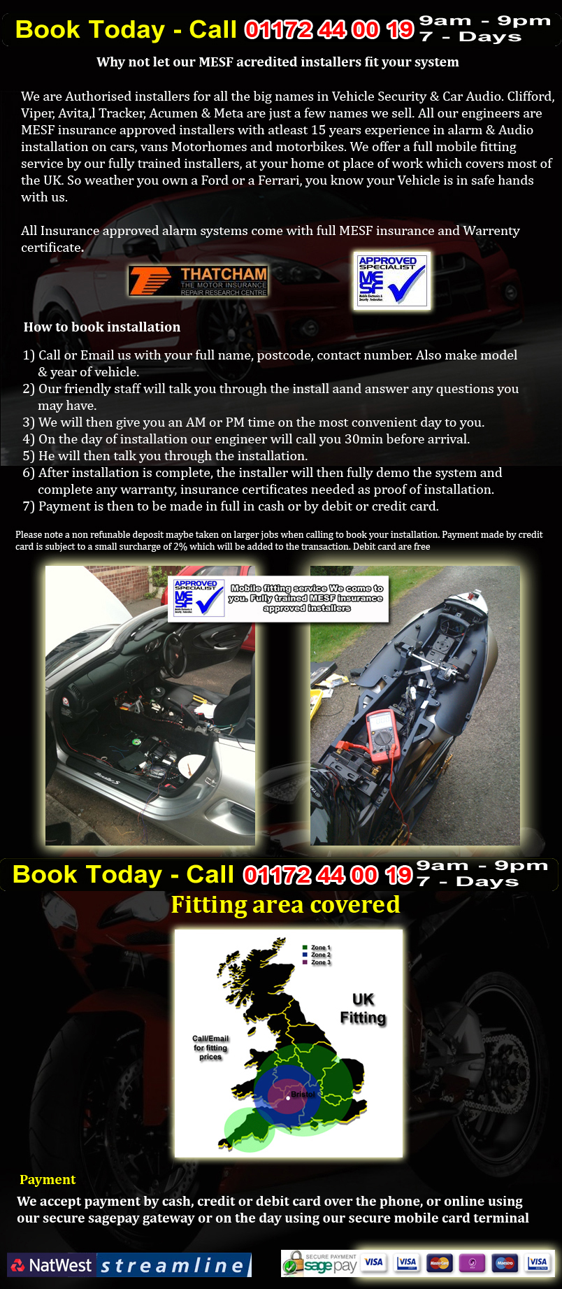 We are Authorised installers for all the big names in Vehicle Security & Car Audio. Clifford, Viper, Avital Tracker, Acumen & Meta are just a few names we sell. All our engineers are MESF insurance approved installers with atleast 15 years experience in alarm & Audio installation on cars, vans Motorhomes and motorbikes. We offer a full mobile fitting service by our fully trained installers, at your home ot place of work which covers most of the UK. So weather you own a Ford or a Ferrari, you know your Vehicle is in safe hands with us.