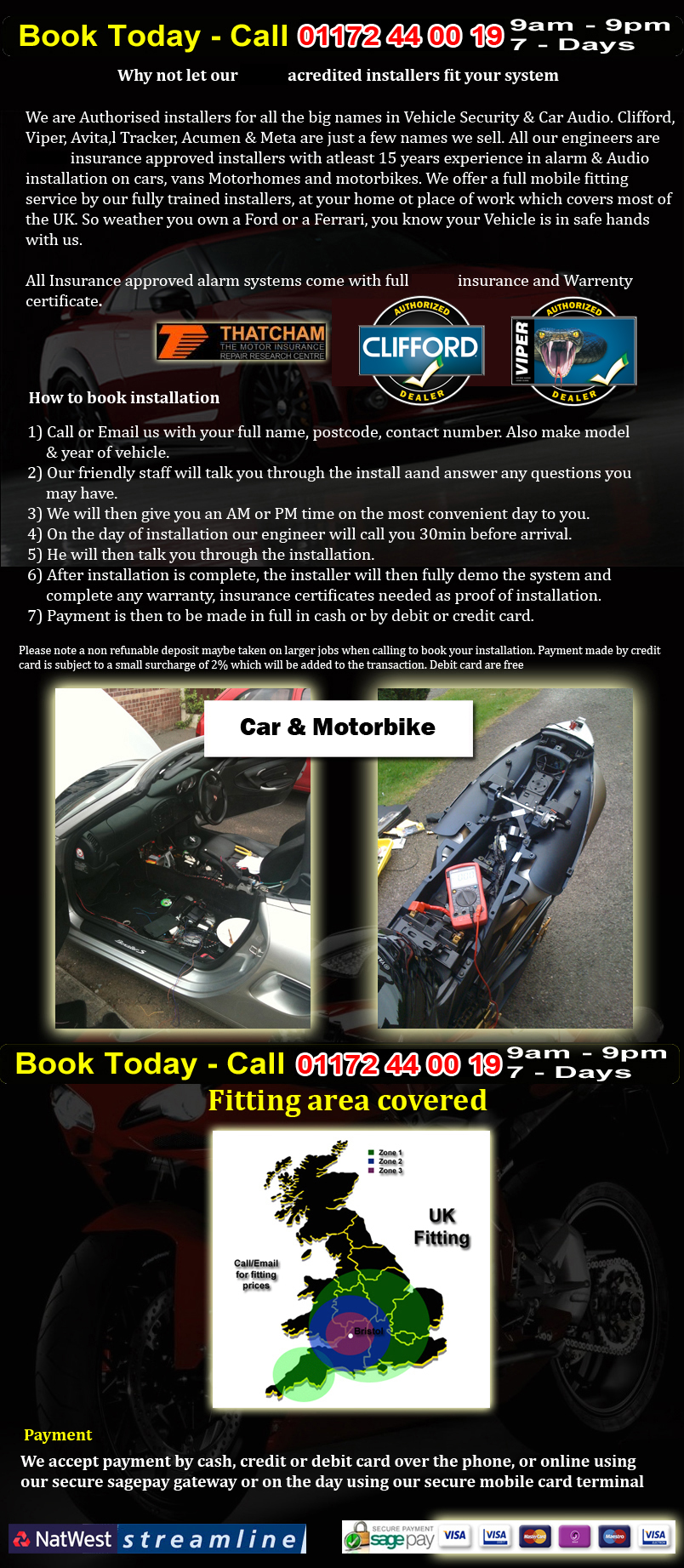 Viper car alarms are the leaders in vehicle security with over 20 years in the insustry. Viper have a car alarms to suit everyones needs weather its Viper cat 1 thatcham approved car alarms to there entry level arrow 5704 car alarms. The 5204 car alarms comes with protection to the boot bonnet and doors aswell as dual shock sensor and immobiliser. The Viper arrow 5.1 car alarm can also be fitted to almost every vehicle on the market today. Viper next car alarms on offer is the viper 5204 2-way pager, which boasts the same features as the viper 5904 car alarms but also comes with a glass tampering sensor, tilt and motion sensor and an extra immobiliser. The Viper 5904 2-way pager car alarms also comes with two 4 button remote when the arrow viper 5704 car alarms only come with 3 button remotes. the viper 5204 2-way pager also comes with vipers super bright blue led. Viper cat 1 entry level car alarm system is the viper cat 1 480xv 2 way pager alarm system. the viper 480xv car alarm is the only 2wway pager thatcham cat 1 car alarm system on the market.. with dual immobilisation . the Viper concept 650 cat 1car alarm system also comes with cliffords battery backup siren and cliffords anti hijack blackjax system. the Viper concept 650 mk2 car alarm also won best car alarm system and best cat1 car alarm system in the 2009 me awards. No other cat 1 thatcham approved car alarm comes close the Viper car alarm. Viper car alarms flagship thatcham cat 1 insurance approved alarm system is the 480xv with remote engine start added to its car alarms system. The Viper 5701 is the new car alarm from viper security. The viper 5701 hyper alarm system comes with 2 way paging and remote engine start as standard. We are based in the bristol city centre and have been fitting clifford car alarms now for over 15 years. We cover mobile fitting in Bristol bath london exeter birmingham coventry leicester cardif newport gloucester yate bristol south west wales essex sussex middlesex luton kent.